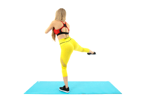 How to do it: Stand with your feet about shoulders-width apart, feet facing forward, and hands grasped together at chest-height. From this position, bend your knees to sink into a deep squat, keeping your shoulders over your hips. As you extend the legs to come back up to a standing position, shift your weight into your left heel and raise your right leg straight out to the side. Release the leg to the floor with control to complete one rep. Complete 25 reps, then switch sides.